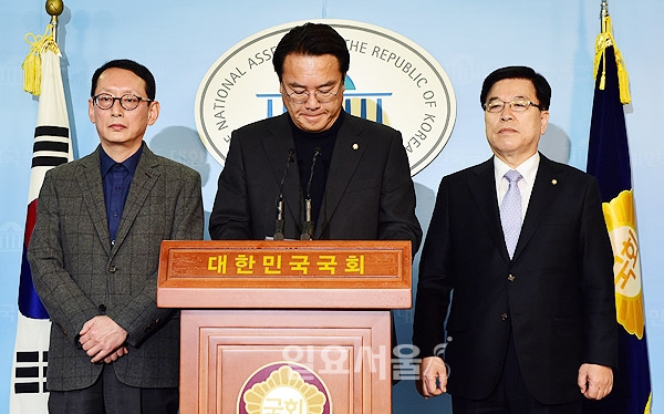 정진석 새누리당 원내대표가 12일 국회 정론관에서 원내대표직 사퇴 기자회견을 하고 있다. 이날 정 원내대표는 김광림 정책위의장, 김도읍 원내수석부대표와 함께 박근혜 대통령 탄핵소추안 국회 가결에 책임을 지고 동반 사퇴한다고 밝혔다.