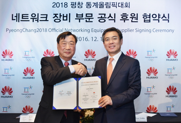 [일요서울 | 강원동부 최돈왕 기자] 평창 동계올림픽대회 및 동계패럴림픽대회 조직위원회는 13일 “이날 오후 서울 종로구 포시즌스 호텔에서 이희범 조직위원장과 옌 리다(Yan Lida) 화웨이 엔터프라이즈 비즈니스 그룹(Huawei Enterprise Business Group) 대표 등 양 기관 관계자들이 참석한 가운데 공식후원 협약을 체결했다”고 전했다.