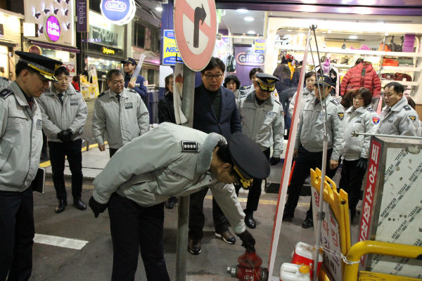 [일요서울 | 경기북부 강동기 기자] 의정부경찰서장(총경 진종근)는, 12월 26일 오후 7시경 서민경제 활성화를 위해 제일시장 번영회를 방문, 이상백 번영회장 등과 함께 간담회를 개최하여 제일시장 상인의 애로사항을 청취한 후 번영회원들과 함께 최근 발생한 대구 서문시장 화재와 관련 소화전을 점검하고, 소매치기 등 절도예방을 위한 합동순찰을 실시했다.