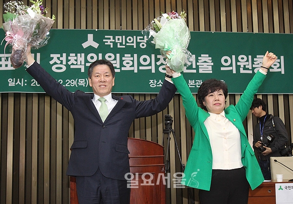 29일 오전 국회에서 열린 국민의당 의원총회에서 선출된 주승용 신임 원내대표와, 조배숙 정책위의장이 손을 들어 인사하고 있다. 2016.12.29 일요서울 정대웅 기자