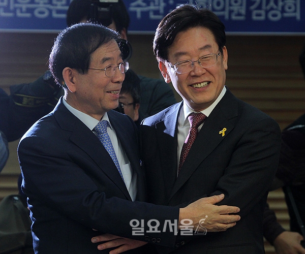 3일 오후 국회 의원회관에서 열린 '민생, 현장에 답이 있다' 토론회에서 박원순 서울시장과 이재명 성남시장이 인사를 나누고 있다.