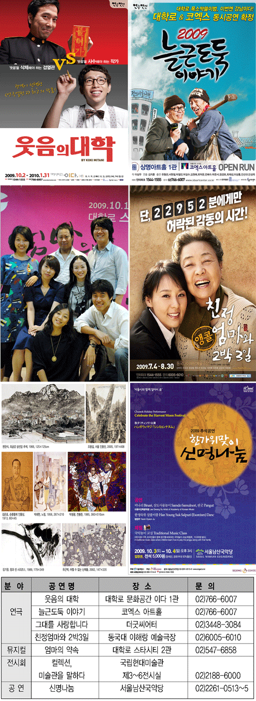 올해 추석 연휴는 3일 밖에 되지 않아 많은 직장인들을 힘들게 하고 있다. 하지만 그렇다고 집안에만 있다면 짧은 휴가를 더욱 의미 없이 보내고 만다. 짧은 추석 연휴를 즐기기 위한 방법으로 문화생활을 해보는 것은 어떨까. 추석에 맞춰 서울 시내 곳곳에서 다채로운 행사와 공연이 펼쳐진다. 또한 젊은 시절 찾았던 소극장을 찾아보는 것도 좋다. <일요서울>은 추석에 가볼만한 공연과 행사를 총정리 해봤다.