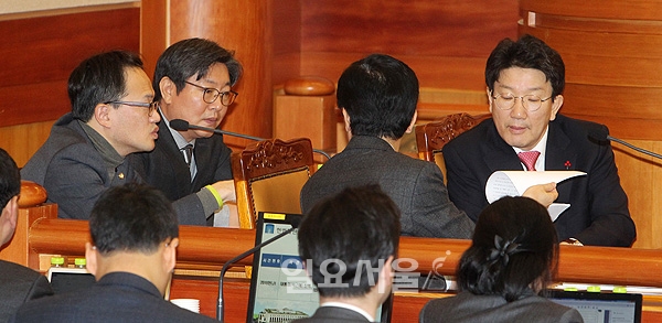 박근혜 대통령 탄핵심판 7차 변론기일이 열린 19일 오전 서울 종로구 헌법재판소 대심판정에서 권성동 국회 탄핵소추위원장(오른쪽) 등 소추위원들이 대화하고 있다. 2017.01.19 일요서울 정대웅 기자