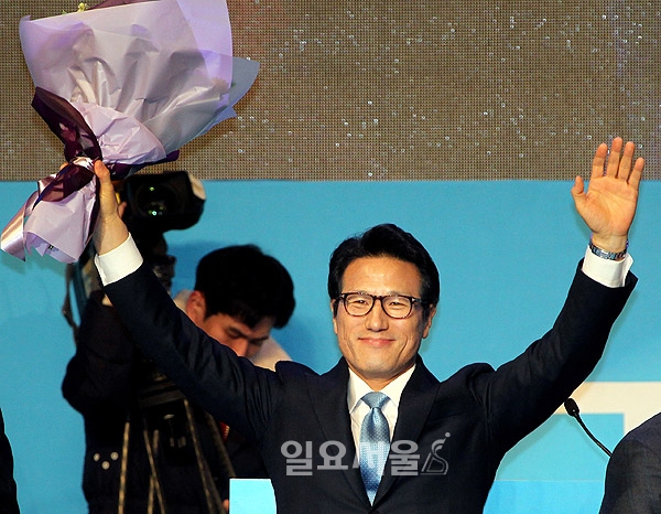 24일 오후 올림픽공원 올림픽홀에서 열린 바른정당 창당대회에서 합의 추대된 정병국 대표가 꽃다발을 들어 환호에 답하고 있다.