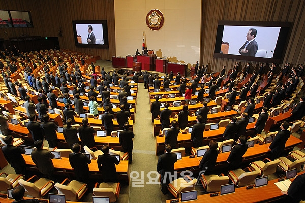1일 오후 서울 여의도 국회 본회의장에서 열린 2월 임시국회 개회식에서 여-야 의원들이 국민의례를 하고 있다. 정대웅 기자 photo@ilyoseoul.co.kr 저작권자 © 일요서울i 무단전재 및 재배포 금지 정대웅 기자 다른기사 보기
