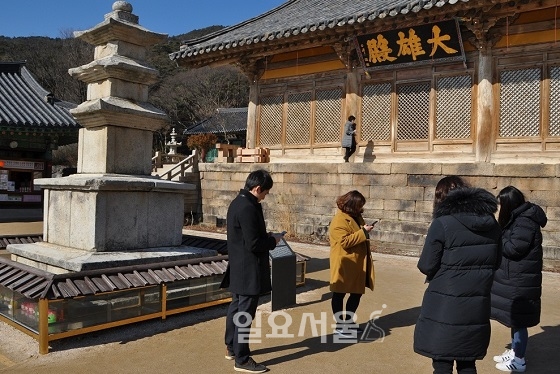 수덕사 대웅전 앞에서 관광객들이 포켓몬고를 즐기고 있다