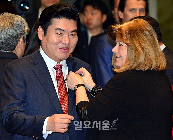 국제올림픽위원회(IOC) 2018 평창동계올림픽 구닐라 린드버그 조정위원장이 8일 오후 서울 국회 예결위회의장에서 열린 새누리당 의원 연찬회에 참석해 원유철 의원에게 평창올림픽 기념배지를 채워주고 있다.