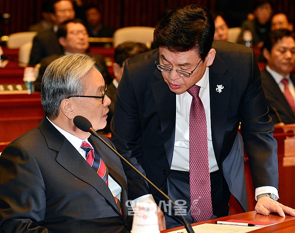 새누리당 인명진 비상대책위원장과 정우택 원내대표가 8일 오후 서울 국회 예결위회의장에서 열린 의원 연찬회에 참석해 논의하고 있다.