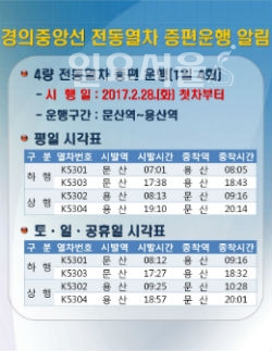 일요서울 | 파주 강동기 기자] 파주시는 경의중앙선 전동열차가 28일 첫차부터 평일 출퇴근 시간 1일 4회 증편 운행한다고 27일 밝혔다.