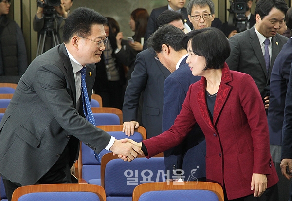 추미애 더불어민주당 대표가 27일 국회에서 열린 긴급 의원총회에 참석하며 송영길 의원과 인사를 나누고 있다. 정대웅 기자 photo@ilyoseoul.co.kr 저작권자 © 일요서울i 무단전재 및 재배포 금지 정대웅 기자 다른기사 보기