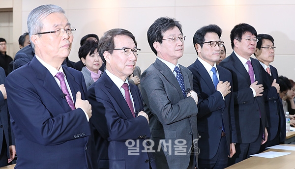 김종인 전 더불어민주당 대표, 정운찬 전 국무총리, 유승민 바른정당 의원이 28일 여의도 이룸센터에서 열린 '한국경제 길을 묻다' 토론회에서 국민의례를 하고 있다. 정대웅 기자 photo@ilyoseoul.co.kr 저작권자 © 일요서울i 무단전재 및 재배포 금지 정대웅 기자 다른기사 보기