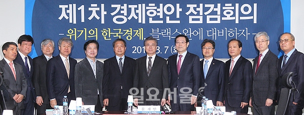 7일 오전 서울 여의도 국회 의원회관에서 열린 경제현안 점검회의에서 문재인 더불어민주당 전 대표 등 참석자들이 기념촬영을 하고 있다.
