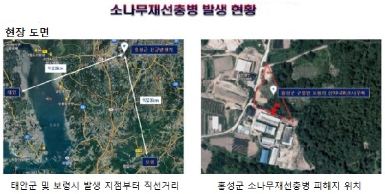 또한 소나무재선충병 발생지역을 포함, 발생지역으로부터 반경 2km 이내에 해당하는 홍성군 구항면(오봉·황곡·공·장양·내현리), 홍성읍(월산리), 홍북면(중계리), 갈산면(신안·갈오·동산리), 예산군 덕산면 낙상리 등 2개 군 11개리 전체지역을 반출금지구역으로 지정해 소나무·곰솔·잣나무 등 소나무류의 이동행위를 금지한다.
