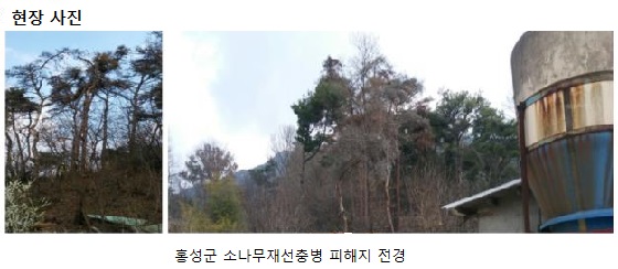 [일요서울ㅣ홍성 윤두기 기자] 충남도는 홍성군 구항면 오봉리 산53-28번지에서 소나무 5본이 재선충병에 감염된 것으로 최종 확인(4월 3일 기준)됨에 따라, 산림청 등 관계기관과 긴급 현장대책 회의를 갖고 역학조사 및 긴급 예찰․방제를 실시한다고 밝혔다.