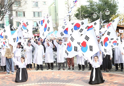 [일요서울 | 대전 박재동 기자]  4일 오후 “대한민국만세” 소리가 대전 유성장터에 메아리로 울려 퍼졌다. 이날 지역 주민 등 500여 명이 참여해 1919년 당시 독립만세 운동의 주역이었던 순국선열들의 애국정신을 이어받아 만세운동을 생생하게 재연했다.