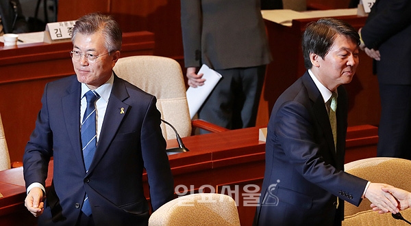 12일 오후 국회에서 열린 '대통령후보 개헌 관련 의견청취 위한 헌법개정특위'에서 문재인 더불어민주당, 안철수 국민의당 대선후보가 엇갈려 지나치고 있다. 2017.04.12 일요서울 정대웅 기자