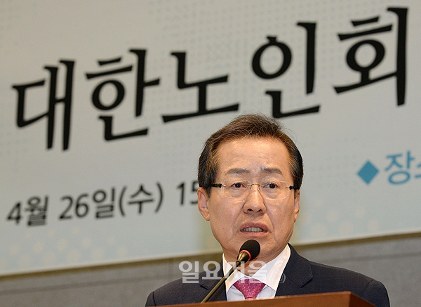 홍준표 자유한국당 대선후보가 26일 오후 서울 용산구 백범기념관에서 열린 대한노인회 대선후보 초청 토론회에서 발표를 하고 있다.