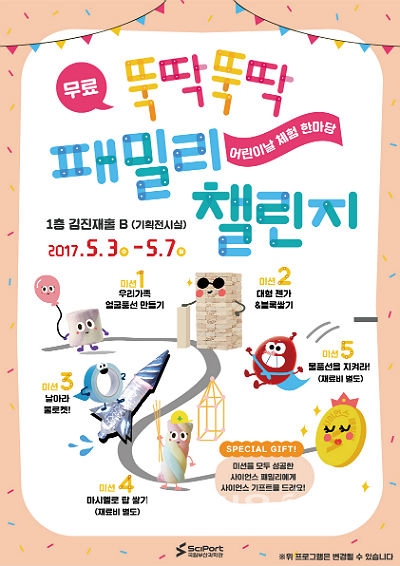 과학관 1층 김진재홀에서 열리는 이번 행사는 ‘우리가족 얼굴 풍선 만들기’, 블록을 쌓아 완성하는 ‘대형 젠가 미션’, 빈 페트병으로 만든 ‘물로켓 발사!’, 스파게티와 마시멜로우로 만드는 ‘마시멜로우 탑쌓기’ 등 가족단위 체험 미션 프로그램 5종이다.