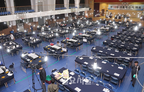 19대 대통령선거를 하루 앞둔 8일 서울 여의도 여의도고등학교에 마련된 영등포구 개표소에서 선관위 관계자들과 각 정당 참관인들이 투표지분류기를 시험 운영하고 있다.
