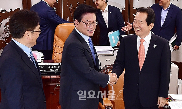 정세균 국회의장과 여야 4당 원내대표가 19일 국회 의장실에서 열린 국회의장-여야 4당 원내대표 정례회동에서 인사를 나누고 있다. 정대웅 기자 jeongpd@ilyoseoul.co.kr 저작권자 © 일요서울i 무단전재 및 재배포 금지 정대웅 기자 다른기사 보기