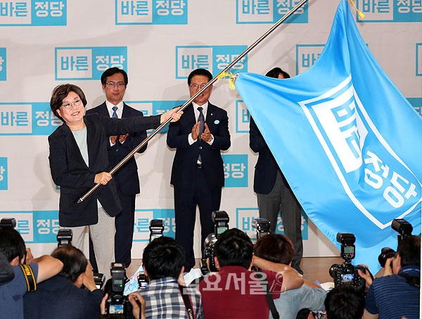 26일 오후 서울 여의도 국회 의원회관 대회의실에서 열린 바른정당 당대표 및 최고위원 지명대회에서 선출된 이혜훈 신임 당대표가 당기를 흔들고 있다.