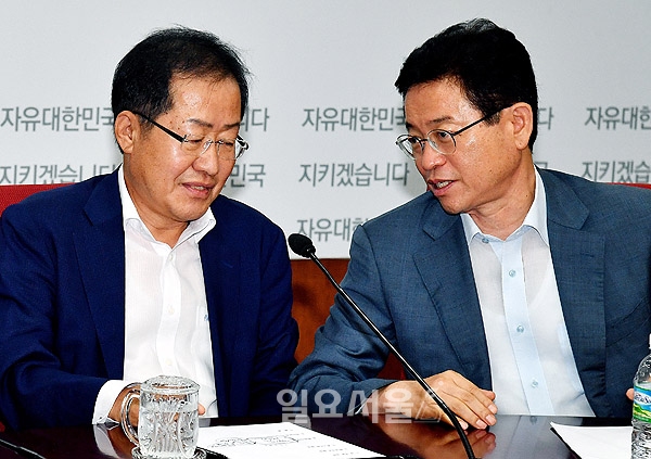 10일 오전 여의도 자유한국당 당사에서 열린 최고위원회의에서 홍준표 대표가 이철우 최고위원과 대화하고 있다.