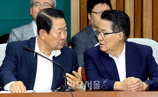 국민의당 박주선 비상대책위원장(왼쪽)이 18일 오후 본회의에 앞서 국회 본청에서 열린 긴급 의원총회에 참석해 박지원 전 대표와 논의하고 있다.