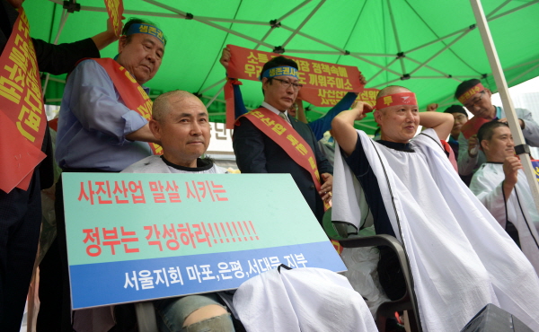 삭발식에 나선 한국프로사진협회 사진사들 <뉴시스>