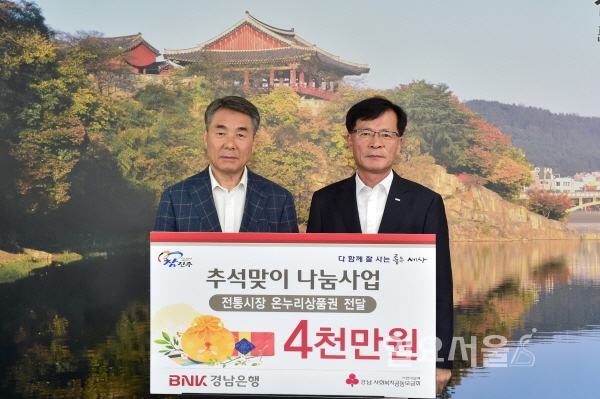 [일요서울ㅣ진주 이도균 기자] 추석을 앞두고 경남 진주시 좋은세상에 어려운 이웃을 향한 나눔의 손길이 이어지고 있다.21일 BNK경남은행에서 4000만 원 상당, 한국남동발전에서 1000만 원 상당, 중소기업중앙회에서 600만 원 상당의 온누리상품권을 기탁했고 나르샤봉사단과 경남리더스 포럼 1기 원우회에서 각 100만 원의 성금을 기탁했다.