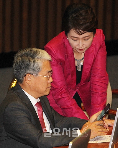 김동철 국민의당 원내대표가 28일 오후 열린 국회 본회의에서 이언주 의원과 대화를 나누고 있다.