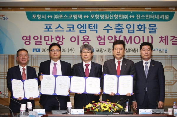 [일요서울ㅣ경북 이성열 기자] 포항시는 25일 시청 중회의실에서 포항영일신항만(주), ㈜포스코엠텍, 진스인터내셔널과 광명일반산업단지 ㈜포스코엠텍 수출입화물 영일만항 이용 협약식을 개최했다고 밝혔다.이날 협약식에는 이강덕 포항시장, 정해종 포항시의회 부의장, 이상우 포항영일신항만(주) 대표이사, 이희명 ㈜포스코엠텍 대표이사, 김진석 진스인터내셔널 대표이사 등 50여명이 참석했다.