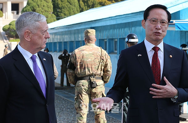 송영무 국방부 장관과 제임스 매티스 미국 국방부 장관이 27일 오후 판문점 공동경비구역(JSA)에서 대북 메시지를 발표하고 있다. 사진공동취재단 정대웅 기자 jeongpd@ilyoseoul.co.kr 저작권자 © 일요서울i 무단전재 및 재배포 금지 정대웅 기자 다른기사 보기