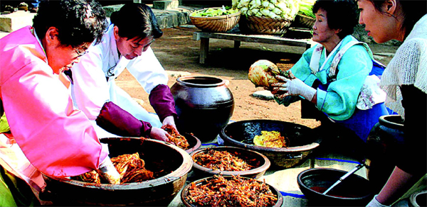 이상실(왼쪽에서 두번째)씨가 동네 여인들과 함께 김장을 버무리고 있다. 이들의 김장 담기는 한국 전통의 맛을 대표해 해외에 전파될 예정이다