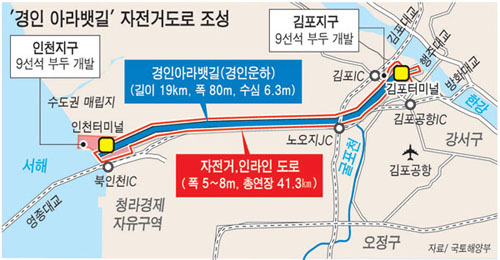 자전거·인라인도로는 수로 양측과 인천·김포터미널 외곽을 따라 폭 5~8m, 총연장 41.3㎞로 조성되며 아라뱃길 개통전까지 행주대교까지 이어진 기존 한강 자전거도로와도 연결할 계획이다.