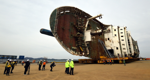 세월호가 인양돼 육상 거치된 지 317일째(316일만)다. 세월호는 선수가 왼쪽으로, 선저(밑바닥)는 바다 쪽을 향하게 거치됐다. 해상에서 약 50~60m 가량 떨어진 위치다.