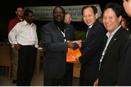 문경시장 주관만찬에서 신현국 시장이 CISM 칼카바 회장에게 기념품을증정하며 악수하고 있다.