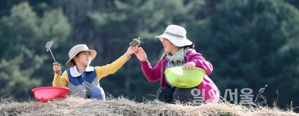 포근한 봄날씨를 보인 27일 지리산 자락인 경남 함양군 마천면 창원마을 논두렁에서 한 가족 냉이, 쑥, 달래 등 봄나물을 캐고 있다.