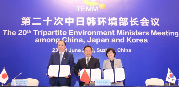 김은경 환경부 장관은 24일 중국 쑤저우에서 열린 '제20차 한·중·일 환경장관회의(TEMM)' 기자회견에 참석해 "'동북아 장거리이동 대기오염물질 공동연구(LTP)' 보고서를 내년 차기 환경장관회의까지 발간하기로 합의했다"며 4가지 공동합의문 내용을 발표했다.