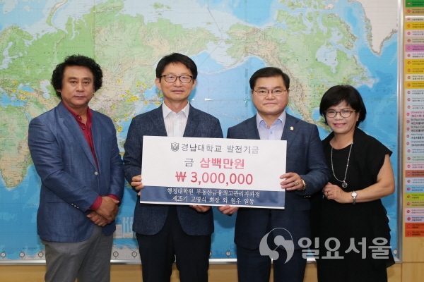 [일요서울ㅣ창원 이도균 기자] 경남대학교 행정대학원(원장 최낙범) 부동산금융최고관리자과정 25기 학생회(회장 고영식)는 10일 오전 11시 30분 대외부총장실을 방문해 경남대학교에 대학발전기금 300만원을 쾌척했다.