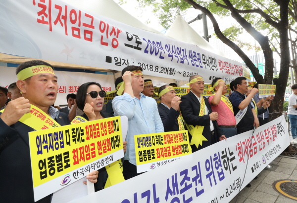 [일요서울 | 오두환 기자] 한국외식업중앙회 회원들이 20일 오후 서울 종로구 광화문광장 인근에서 제1차 최저임금 인상 규탄집회 중 자영업자 생계 대책 마련을 촉구하는 구호를 외치고 있다.
