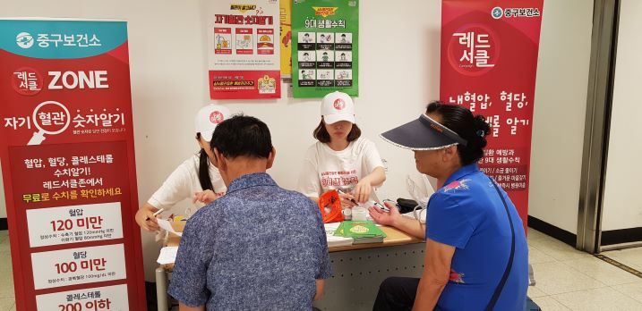 그 일환으로 중구보건소는 “자기혈관 숫자알기, 레드서클 캠페인”이라는 슬로건을 내걸고 보건소 2층 상담실, 이마트 동인천점, 롯데마트 영종도점 및 캠페인 참여 사업장과 건강아파트 등에 레드서클 존(혈압 혈당 콜레스테롤 수치 측정 및 심뇌혈관질환 예방관리방법 등을 안내 받을 수 있는 건강부스)을 운영하였다.