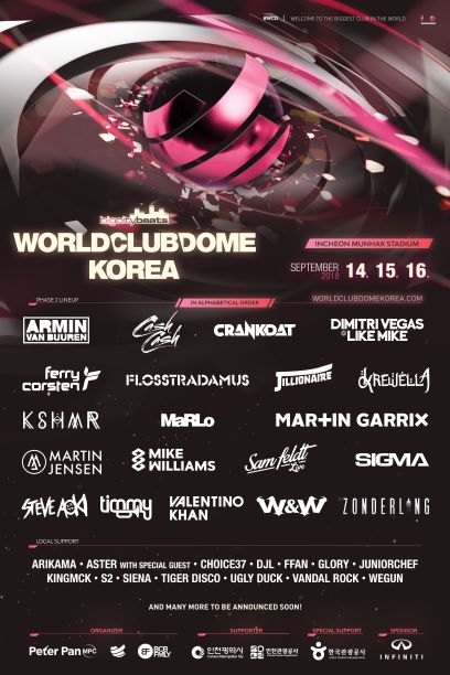 오는 14일부터 16일까지 3일간, 문학경기장에서 개최되는“월드클럽돔 코리아”는 지난달 31일 2017년 디제이 세계랭킹 1, 2, 3위인 마틴 게릭스(Martin Garrix), 디미트리 베가스 & 라이크 마이크(Dimitri Vegas & Like Mike), 아민 반 뷰렌(Armin Van Buuren)을 비롯하여 국내에서 큰 인기를 모으고 있는 캐쉬 캐쉬(Cash Cash), 더블유&더블유(W&W), 킹맥(Kingmck)등 정상급 디제이들이 최종라인업과 스테이지별 출연진, 프로그램을 발표하며 팬들의 기대를 높이고 있다.