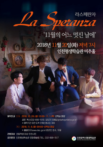 [일요서울|인천 조동옥 기자] 인천평생학습관(관장 김선미)이 다음달 20일 저녁 7시 미추홀에서  La Speranza 의 ‘11월의 어느 멋진 날에’ 콘서트를 개최한다.