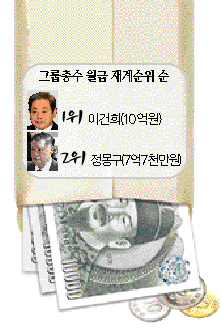 그렇다면 대기업 총수들과 유명 최고경영자(CEO)들의 월급은 얼마나 될까. 2006년 건강보험공단이 국회에 낸 ‘표준보수월액 5000만원이상 고소득자’ 자료에 따르면 이건희 삼성그룹 회장은 10억원, 정몽구 현대·기아차그룹 회장은 8억원을 받는다. 표준보수월액이란 건강보험료를 산출하는 근거로 식비·차량유지비 등 비과세소득을 뺀 한 달 소득 총계(수당과 성과급 포함)를 말한다. 샐러리맨들의 큰 궁금증 가운데 하나인 주요 그룹회장들의 월급명세를 들여다봤다.