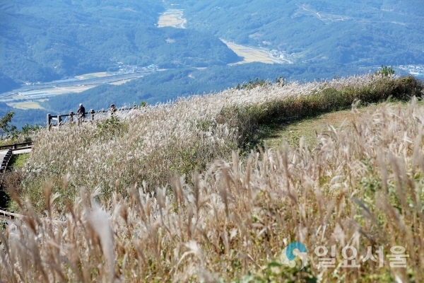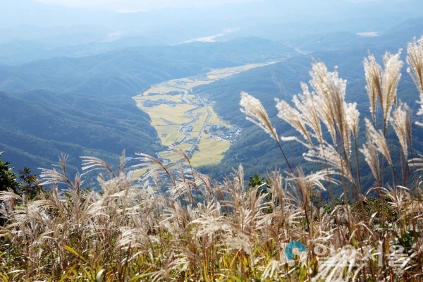 의령 자굴산 쇠목재에서 바라 본 색소폰도로의 주위로 오색단풍이 형형색색으로 물들었고 한우산 정상의 억새풀이 한들한들 가을 바람에 은빛으로 출렁이고 있어 단풍드라이브 코스로 인기가 높다.