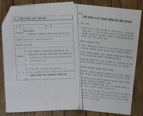 특히 이 회의자료는 감사기능 축소에 대한 개혁방안란에 “조합 자체감사는 정기감사를 매 회계연도 중 1회, 부정기감사의 경우에는 1회에 한해 3일 이내로 실시한다”고 규정해 놓았다. 또 “부정기감사가 더 필요한 경우에는 조합감사가 조합감사위원회에 요청”하도록 했다.