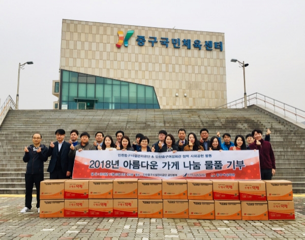 이번 행사는 연말을 맞이하여 인천중구시설관리공단 임직원들이 정성으로 모은 물품을 ‘아름다운가게’에 기증하고, 그 판매 수익금을 관내 지역 소외계층을 위한 지원금으로 활용하기 위하여 마련됐다. 기부물품으로는 쌀, 옷가지, 책, 신발, 가전제품 및 잡화 등 총 500여점이 모였다.