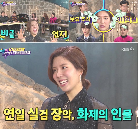 주식회사 오뚜기 창업주 손녀로도 알려져 있는 뮤지컬 배우 함연지는 “내가 311억의 주식을 보유하고 있다는 걸 기사를 통해 알았다”고 말해 시청자들을 깜짝 놀라게 만들었다. 그녀는 “주식이 있다는 건 알고 있었지만 이해가 잘 안가는 액수다. 제가 이해하는 돈의 범위는 제가 공연을 해서 받는 공연료 정도인 것 같다”라며 솔직한 마음을 전했다. 이어 함연지는 “기사를 보고 너무 놀라 엄마에게 전화를 해 봤더니 엄마가 ‘그렇게 있니?’라고 하시더라”며 상황을 재연해 웃음을 자아냈다.