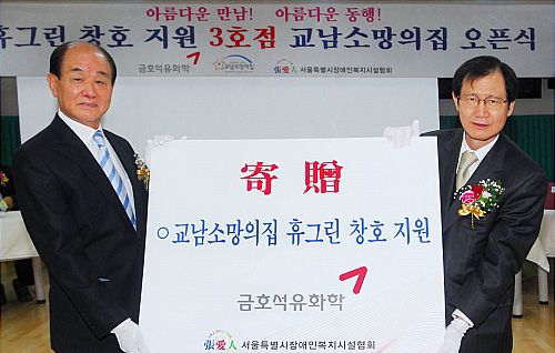 금호석유화학은 이날 박찬구 회장이 참석한 가운데 장애인의 날을 맞아 서울 강서구 화곡동 소재 지적 장애인 시설인 교남소망의집에서 자원봉사 협약식을 체결하고 낡은 창호시설을 바꿔주는 행사를 가졌다.