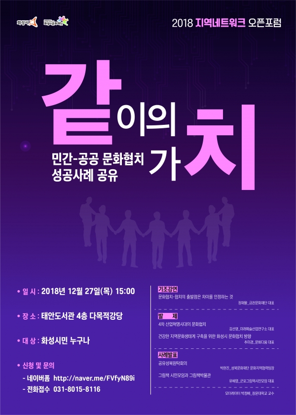 [일요서울|화성 강의석 기자] (재)화성시문화재단은 오는 12월 27일(목) 화성시립태안도서관에서 2018 지역네트워크 오픈포럼 '같이의 가치 – 민간·공공 문화협치 성공사례 공유'를 진행한다.